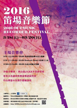 3月18日(金)から20日(日)にかけて、台湾南部の台南市にて、リコーダーフェスティバル - 2016 笛場音楽節 - が開催されます。竹山木管楽器製作所が出展いたしますので、お知らせいたします。「リコーダーの音づくり体験」も予定されています。皆さまのご来場をお待ちしております。 # ---------------------------------------- # We will join in the 2016 Octmusic Recorder Festival in Tainan, Taiwan, from March 18 (Fri) to 20 (sun). We will exhibit our instruments and hold the Recorder making workshop at that time. We are looking forward to seeing you at the venue. http://2016octmusicfestival.strikingly.com/ |